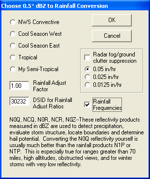GetNexrad converts radar dBZ to rainfall and snowfall amounts with loops and
